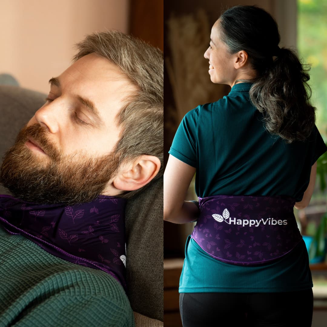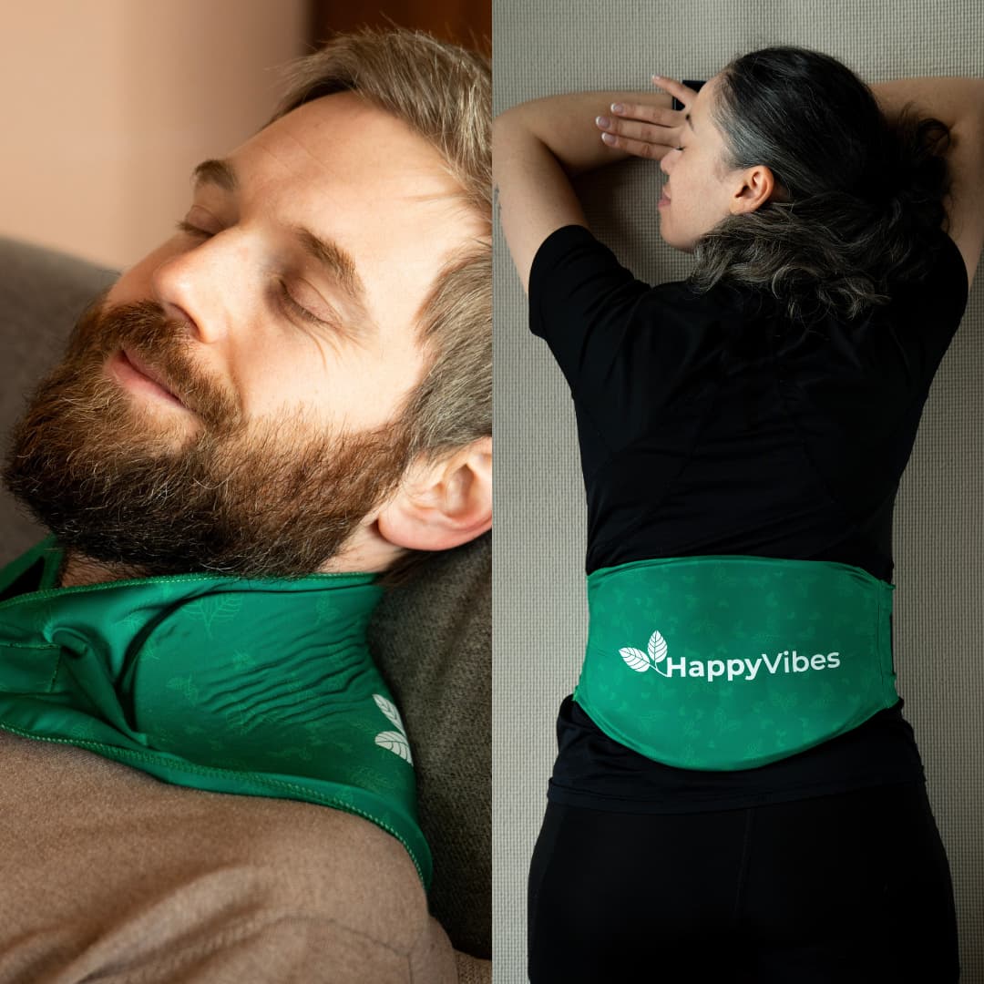 HappyVibes TerapiKrage og TerapiBelte inneholder geléputer som kan kjøles ned for kuldeterapi eller varmes opp for varmeterapi. Dette sikrer en behagelig og naturlig lindring mot de plagsomme smertene i hele ryggsøylen.
